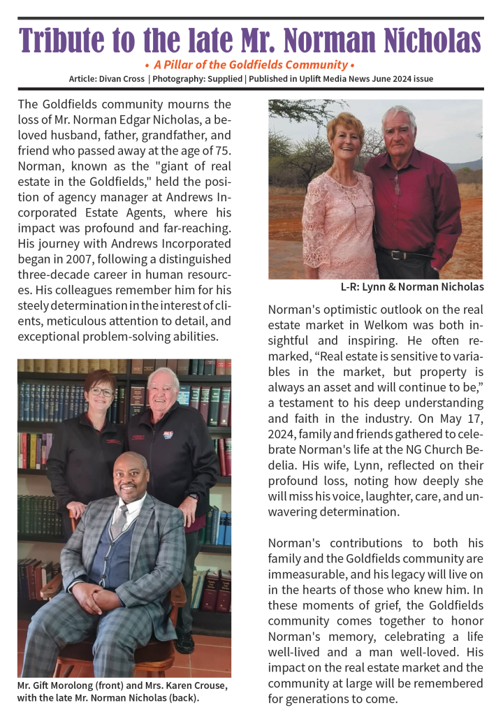 One finger cannot lift a pebble. This is the philosophy of Adv. Gift Morolong, new owner of Andrews Incorporated in Welkom, who is determined to honor the legacy and principles of the late Mr. John Andrews, his mentor and friend for many years.